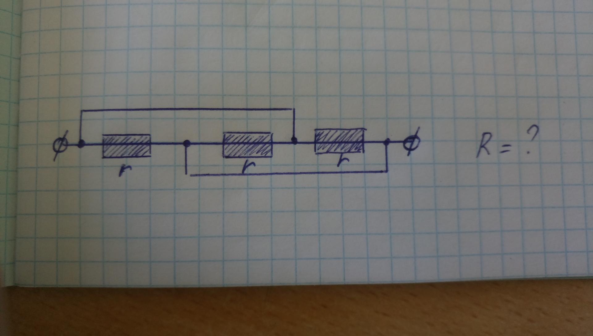 Здесь все три резистора соединены параллельно, только изображение специально "запутали". При одинаковых номиналах резисторов R=r/3