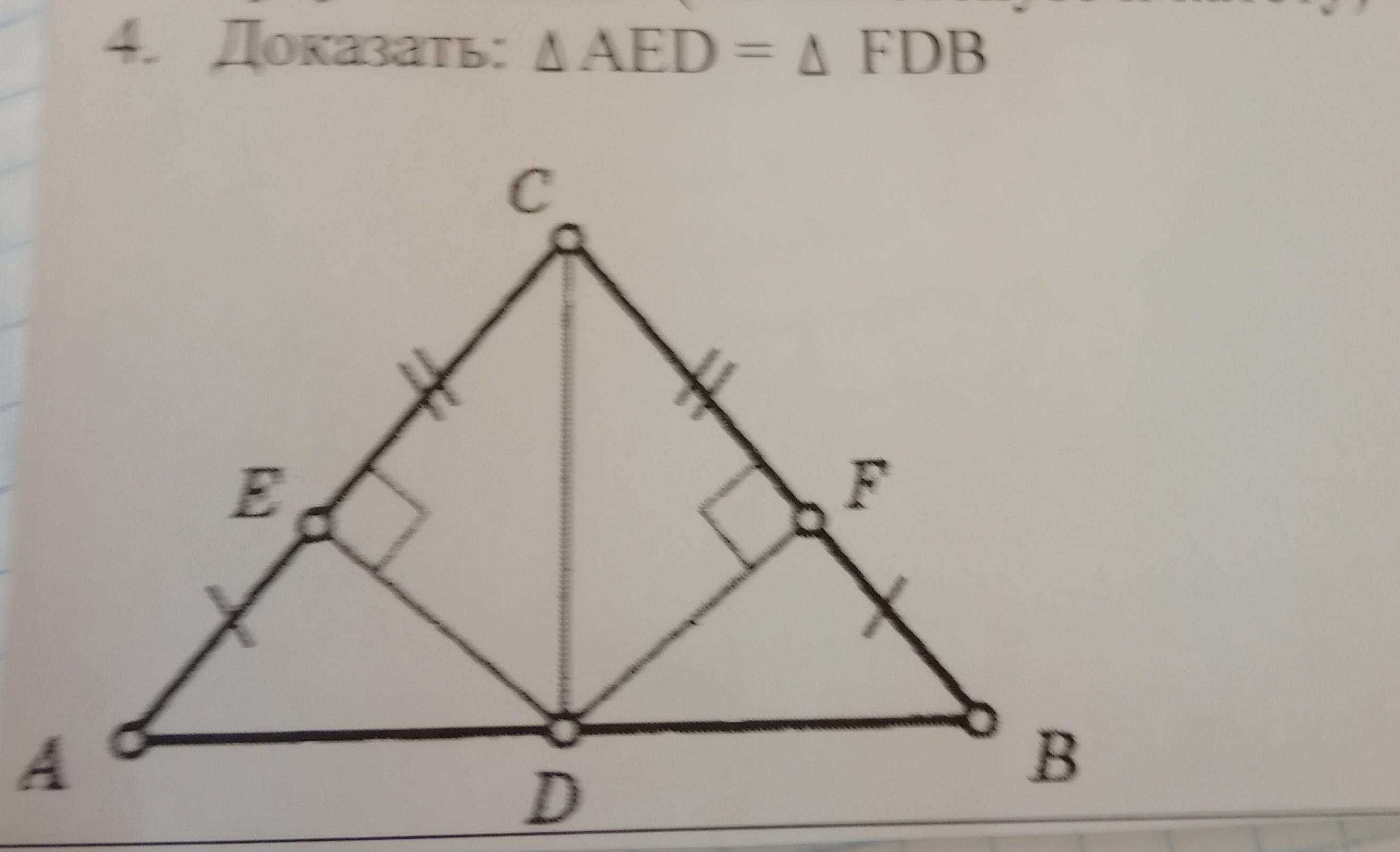 Запись в условии "ΔAED=ΔFDB" недопустима (∠A≠∠F- !) , так как в равенстве треугольников записываются соответствующие вершины равных треугольников, то есть: ∠A=∠B, а сторона AE=BF и тд.
