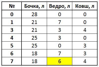 В бочке 28 л воды. Имеется ведро объёмом 7 л и ковш объемом 4 л. Требуется набрать в ведро 6 л воды. Как выполнить задания используя имеющиеся ёмкости?