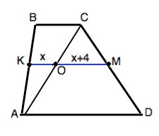 Обозначим трапецию АВСD. КМ - средняя линия, О - точка ее пересечения с диагональю АС.
