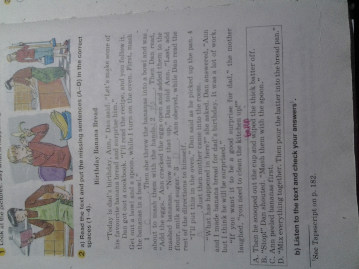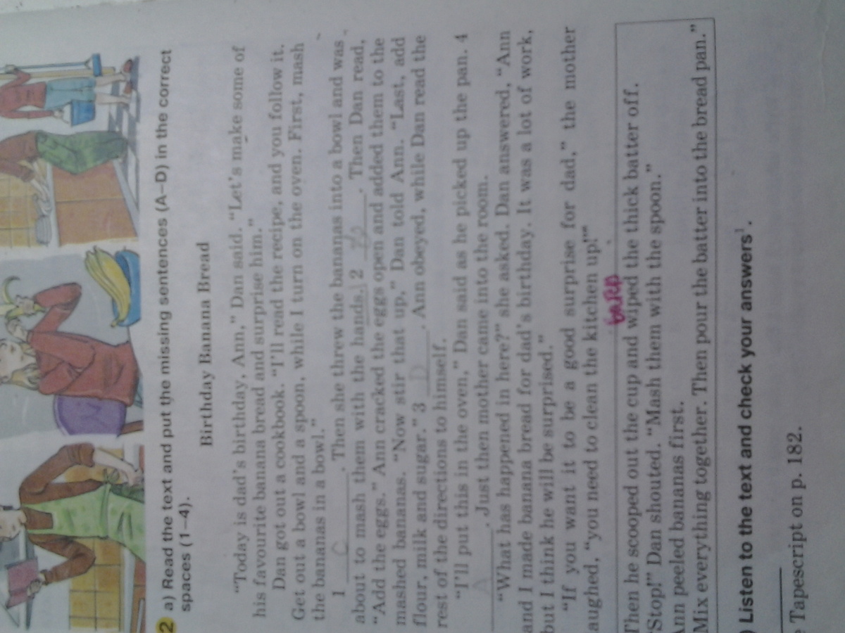 "Я поставлю это в духовку"-, сказал Ден и взял сковороду. Затем он зачерпнул тонкий слой масла и протер сковороду. В тот момент мама зашла в комнату. "Что тут происходит?"-, спросила она. " я и Энн делаем банановый хлеб к папиному дню рождению, это заняло у нас много работы но мы думаем он обрадуется"