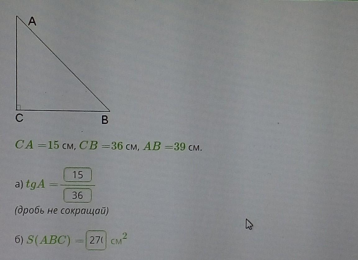 Нет, не правильно, Вам надо 36/15, т.к. тангенс А это отношение противолежащего катета СВ к прилежащему к углу А катету АС