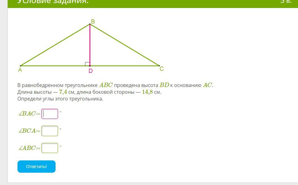 В прямоугольном треугольнике АВД гипотенуза АВ в два раза больше катета ВД, действует правило-Если катет прямоугольного треугольника равен половине гипотенузы, то угол, лежащий против этого катета, равен 30° (угол ВАС).Т.к. треугольник равнобедренный, то углы его при основании равны, значит ВАС=ВСА=30°.Найдем угол АВС по теореме о сумме углов в треугольнике 180° – (30°+30°)=120°.