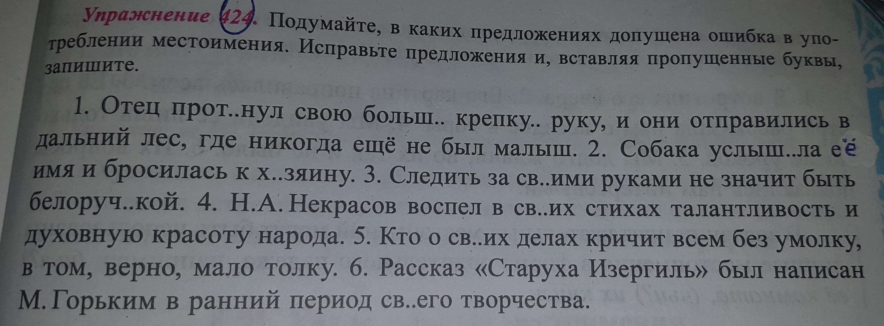 1. Отец тронул свою большую крепкую руку, и они отправились в дальний лес, где никогда ещё не был малыш. 2.собака услышала ее имя и бросилась к хозяину. 3. Следить за своими руками не значит быть белоручкой 4. Н. А. Некрасов воспел своих стихах талантливость и духовную красоту народа 5. Кто о своих делах кричит всем без умолку, в том, верно, мало толку. 6. Рассказ "Старуха Изергиль" был написан М. Горьким в ранний период своего творчества
