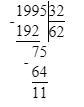 1995 ÷ 32 = 62 целых 11 в остатке = 62 11/32
