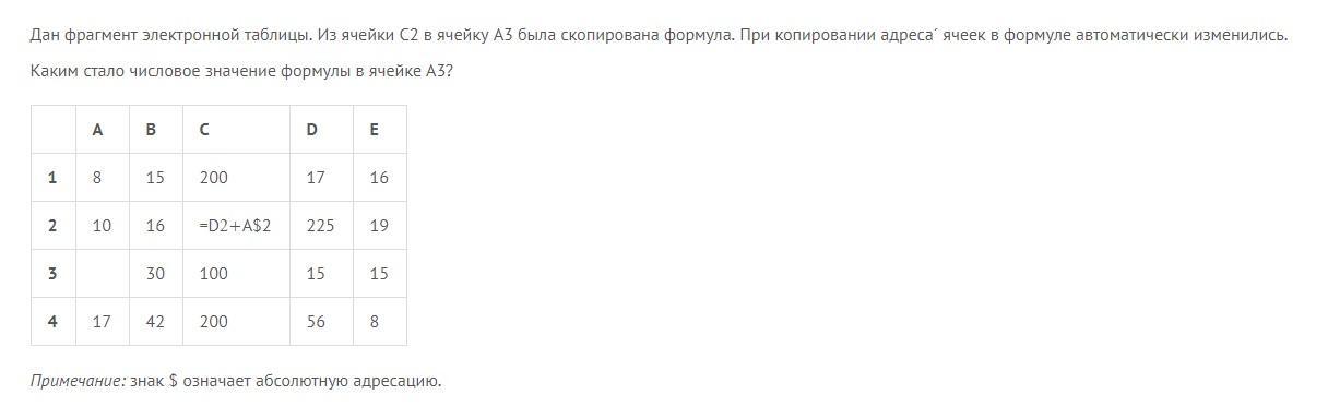 Так как строка является абсолютной, то при копировании значение формулы будет равно D3+A$2, соответственно значение ячейки будет равно 15+10=25