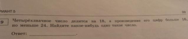 Пошаговое объяснение:Если число делится на 18, значит, оно делится на 9 и на 2. Признаком делимости числа на 9 является то, что сумма его цифр делится на 9. А признаком делимости на 2 является четность числа. Итак, подберем такие 4 цифры, чтобы в сумме они были кратны 9, последняя цифра была четной, а их произведение находилось в диапазоне (16; 24). Цифра 0 сразу исключается (даст произведение цифр, равное 0). Значит, в конце поставим, например, цифру 2. Остальные три подберем: