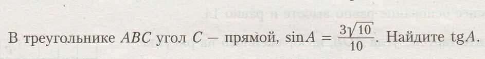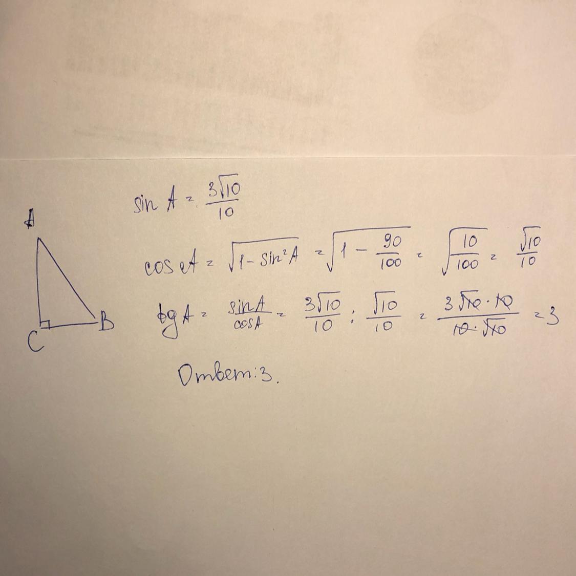 cosA = √1-sinA = √1-(3√10/10)² = √1-9/10 = √10/10 ⇒ tgA = sinA : cosA = (3√10/10) : (√10/10) = 3