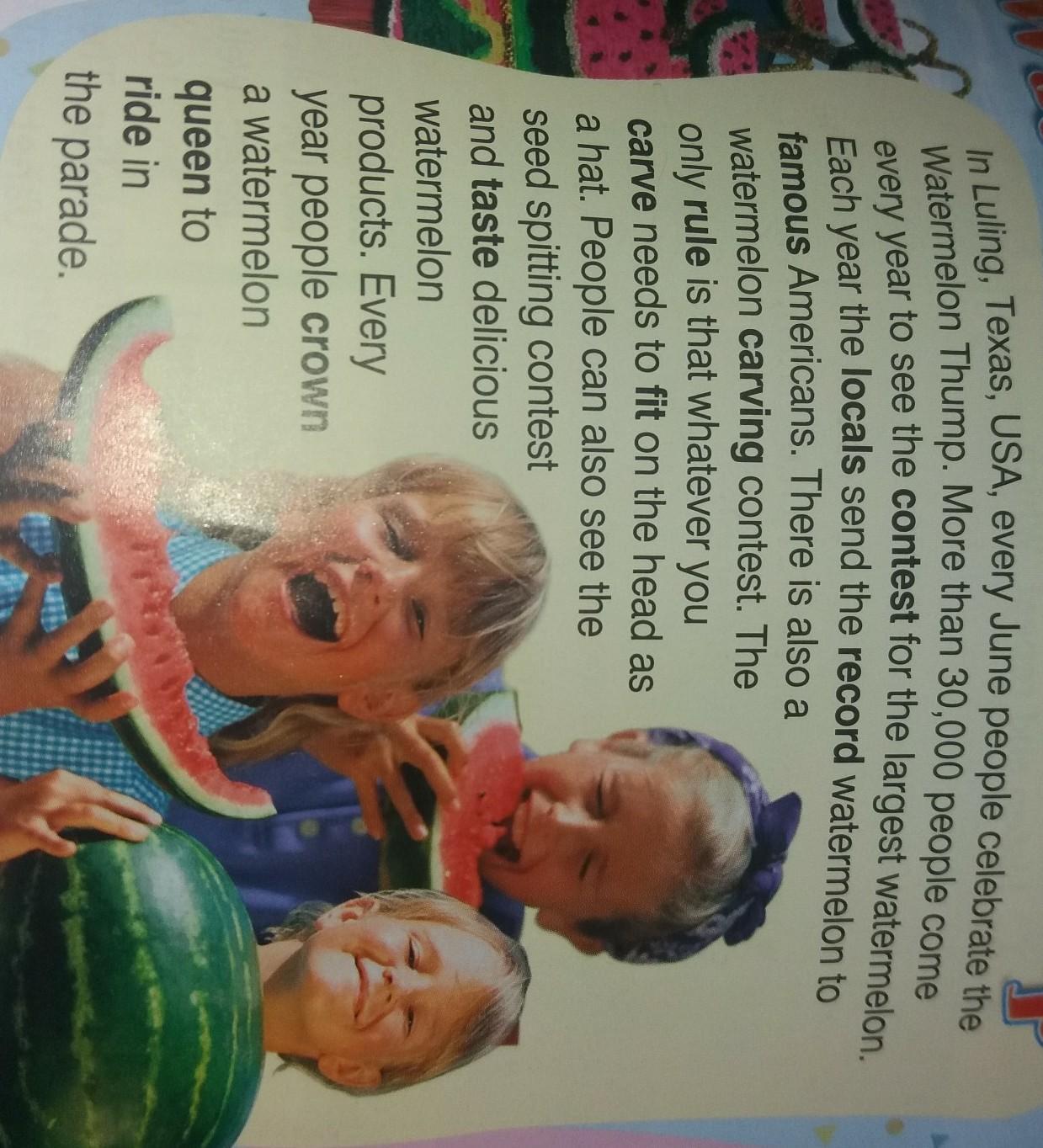 в Люлинге, штат Техас, США, каждый июнь люди отмечают арбузный стук. Ежегодно более 30000 человек приезжают посмотреть конкурс на самый большой арбуз. Каждый год местные жители посылают рекордный арбуз известным американцам. Существует также конкурс резьбы по арбузу. Единственное правило заключается в том, что все, что вы вырезаете, должно быть в форме шляпы. Люди также могут увидеть конкурс плевания семян и попробовать вкусные арбузные продукты. Каждый год люди коронуют арбузную королеву, чтобы покататься на параде.