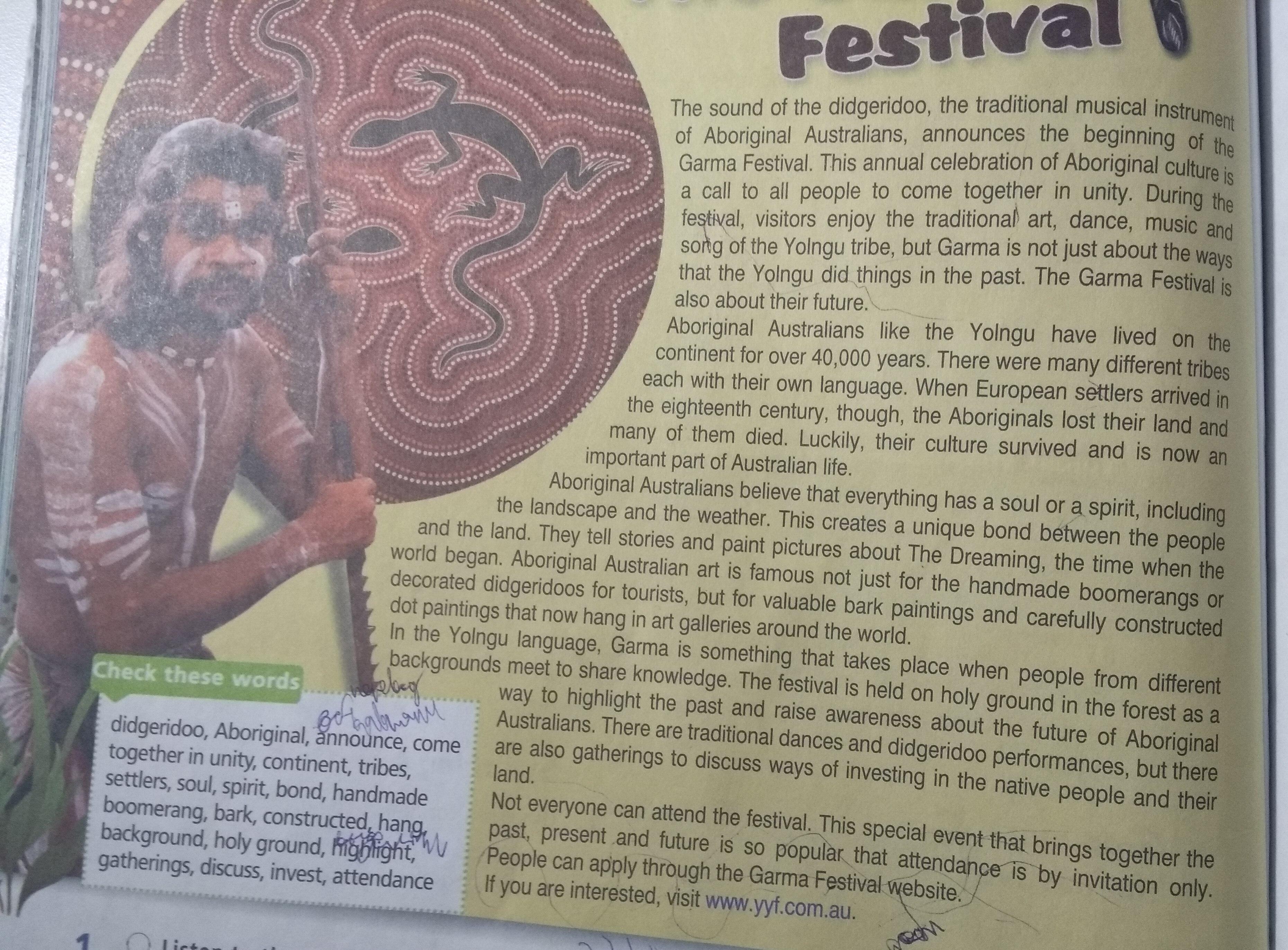 The sound of the didgeridoo, the traditional musical instrument of Aboriginal Australians, announces the beginning of the Garma Festival. This annual celebration of Aboriginal culture is a call to all people to come together in unity. During the festival, visitors enjoy the traditional art, dance, music and song of the Yolngu tribe, but Garma is not just about the ways that the Yolngu did things in the past. The Garma Festival is also about their future. Aboriginal Australians like the Young have lived on the continent for over 40,000 years. There were many different tribes each with their own language. When European settlers arrived in the eighteenth century, through, the Aboriginals lost their land and many of them died. Luckily, their culture survived and is now an