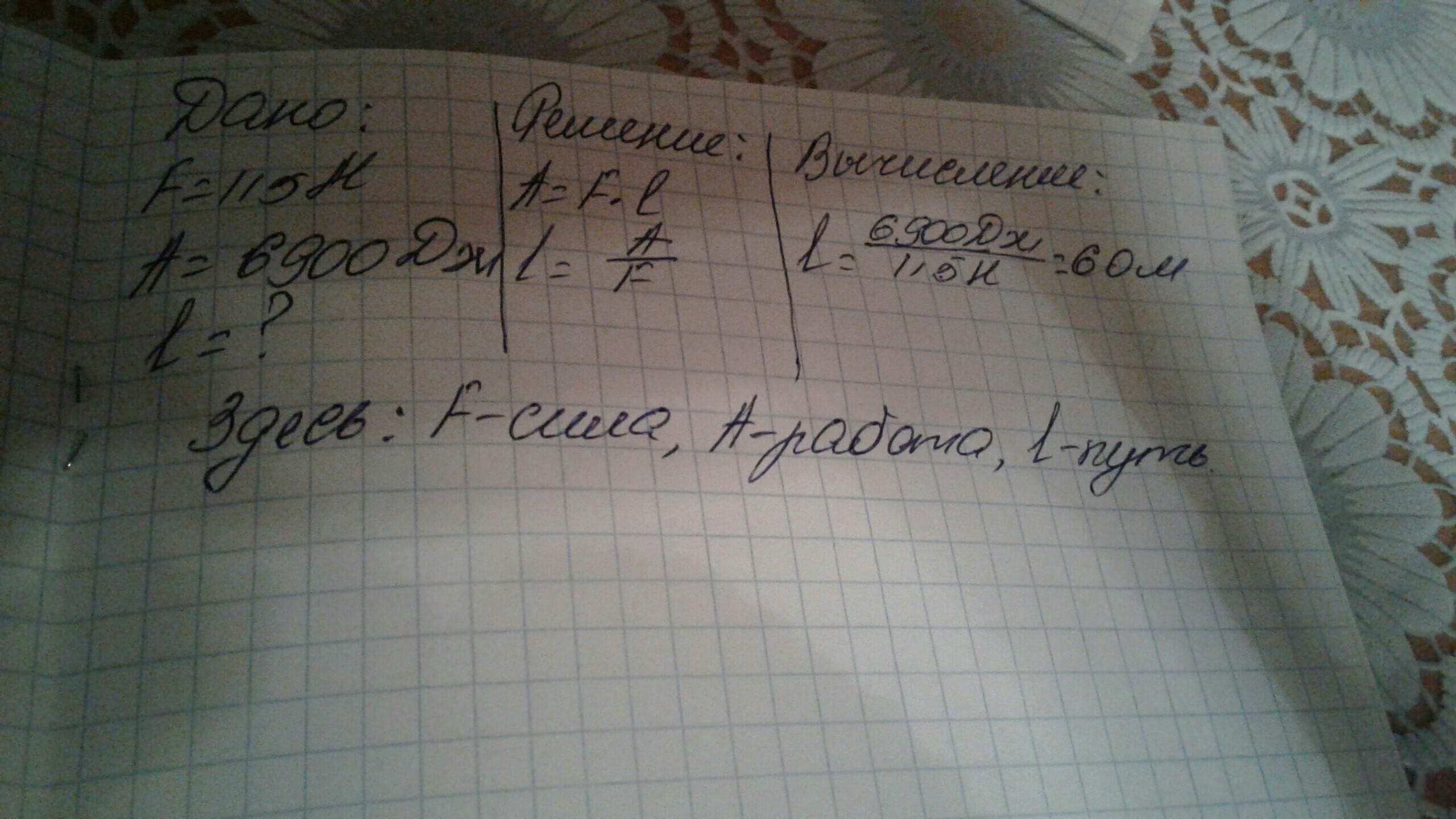 Рабочий перекатил вагонетку,прилагая силу 115Н,совершив при этом работу 6900Дж.Вычислить путь,пройденный вагонеткой.ПОМОГИТЕ ПОЖААААААЛУУУУУУУЙСТААААААА НИЧЕГГООО НЕ ЗНААЮ!!!!!!!!!!!!!!!!!!!!!!!