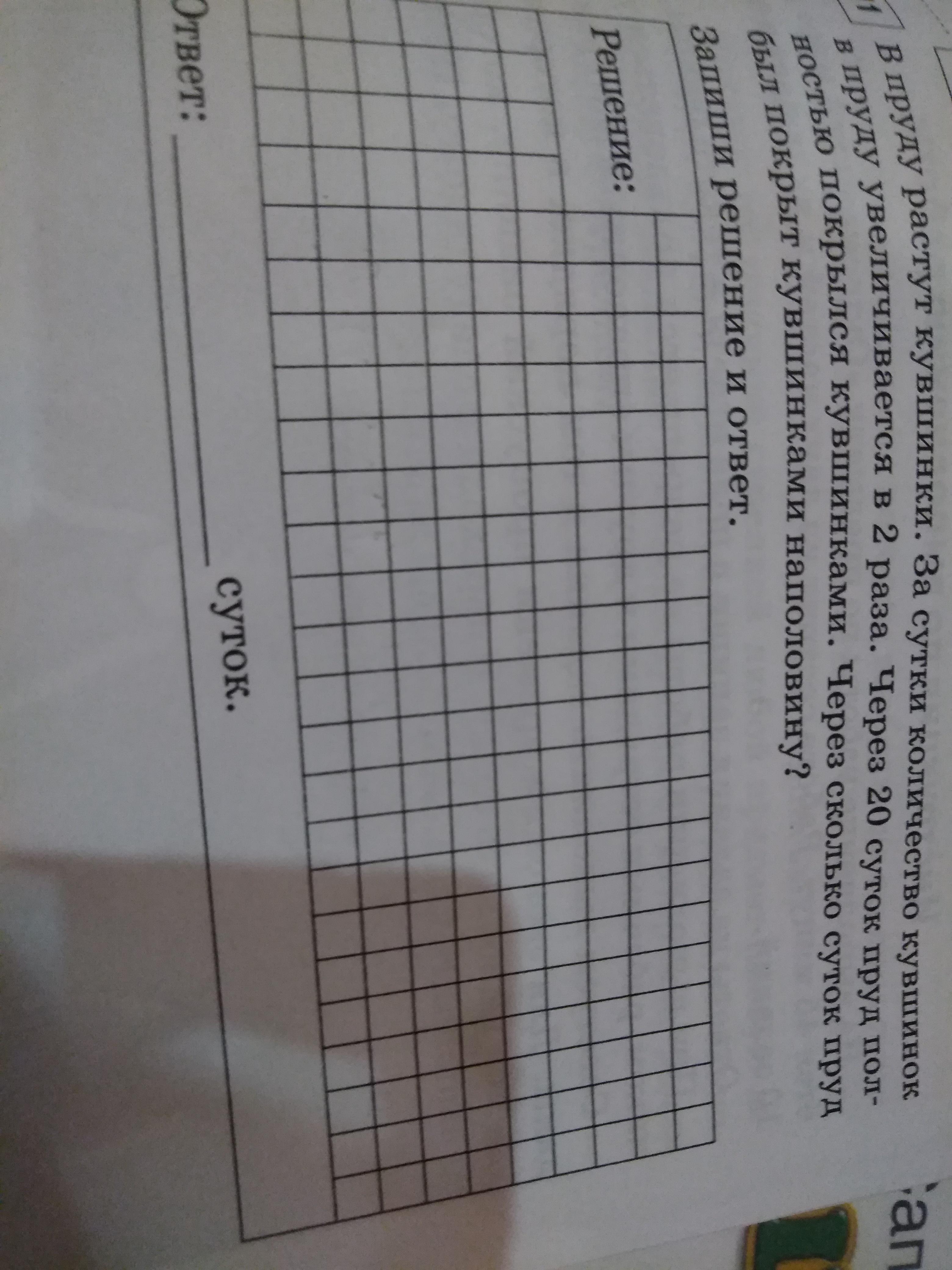 Ответ:20:2=10(с)-за 10 суток пруд покрылся на половину