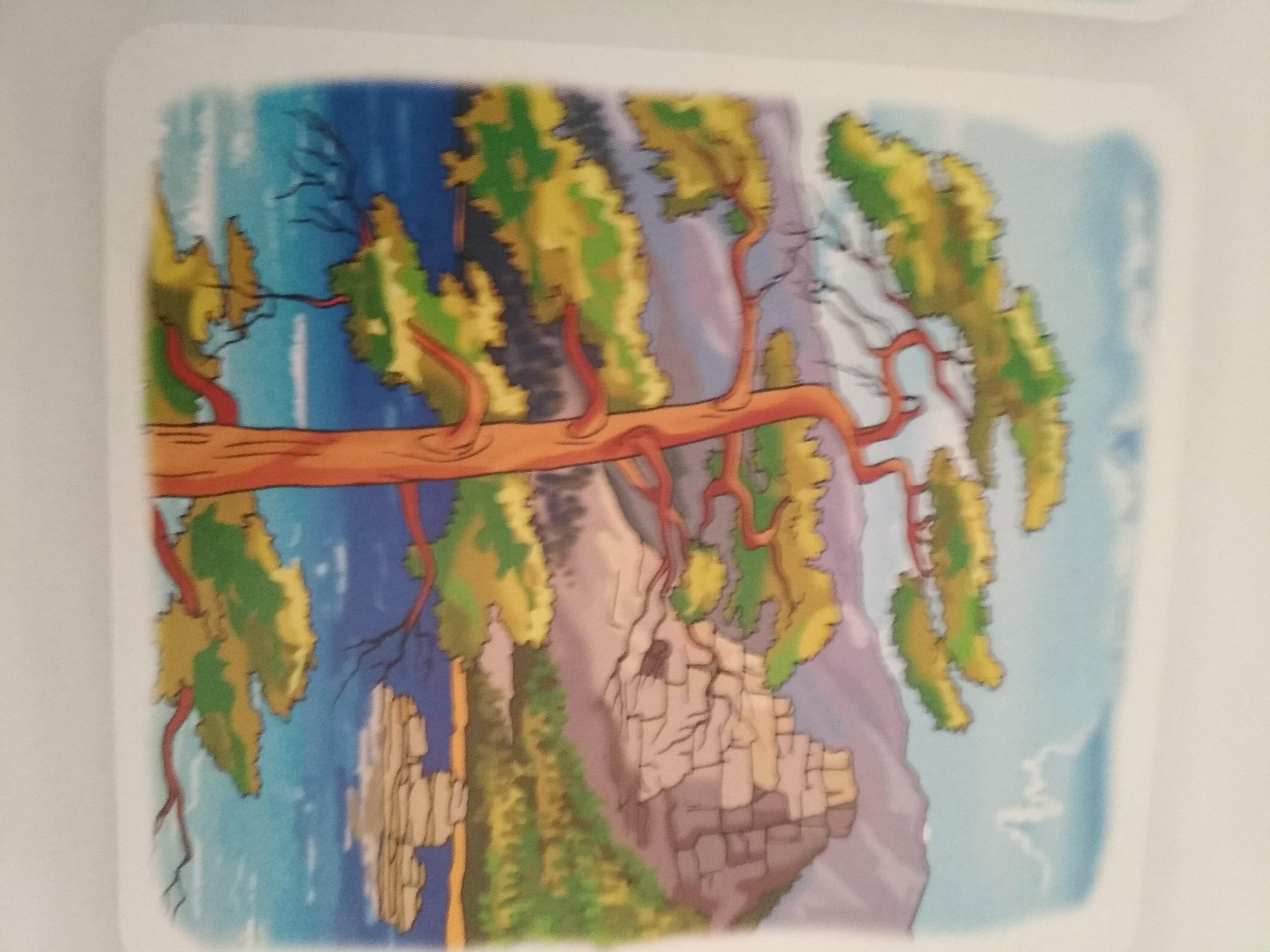 Бұл ағаш. Ол өзеннің жанында тұр. Ағаш ұзын болып өсті. Оның жапырақтары да, құлпырап тұр. Оның артқы жағында әдемі тастан жасалған тау тұр. Ал, өзен жанында кіп-кішкентай тастардан жасалған тау тұр. Бұл ағаш қартайғанда өзенге қылап түседі. Себебі, өзен оның артында тұр.