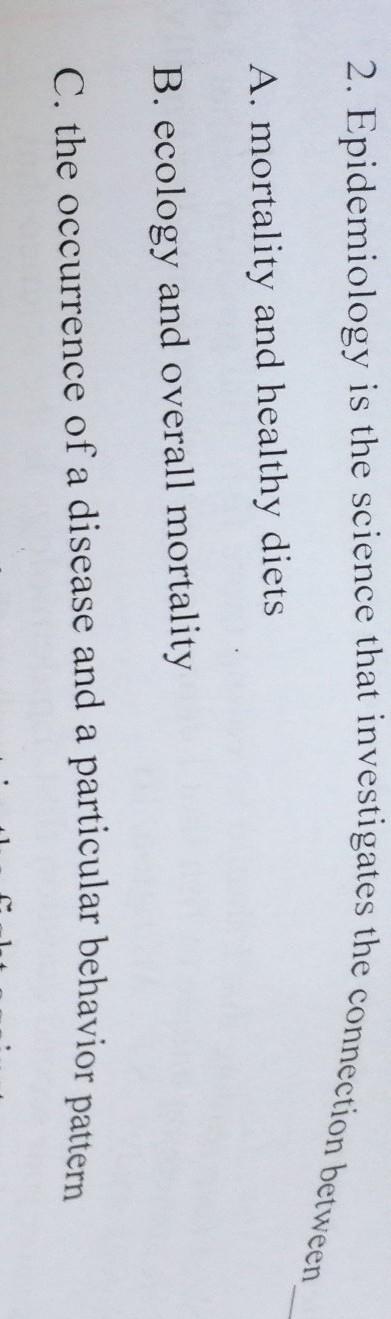 Эпидемиология - это наука, которая исследует связь между A. Смертностью и здоровым питанием B. Экологией и общей смертностью C. Возникновение заболевания и особого поведения