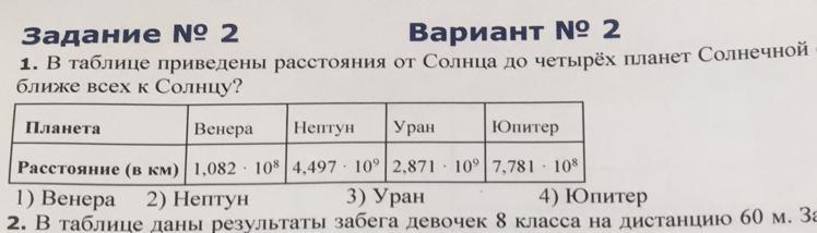 В таблице приведены настояния от Солнца до четырёх планет солнечной системы. Какая из этих планет ближе все к солнцу