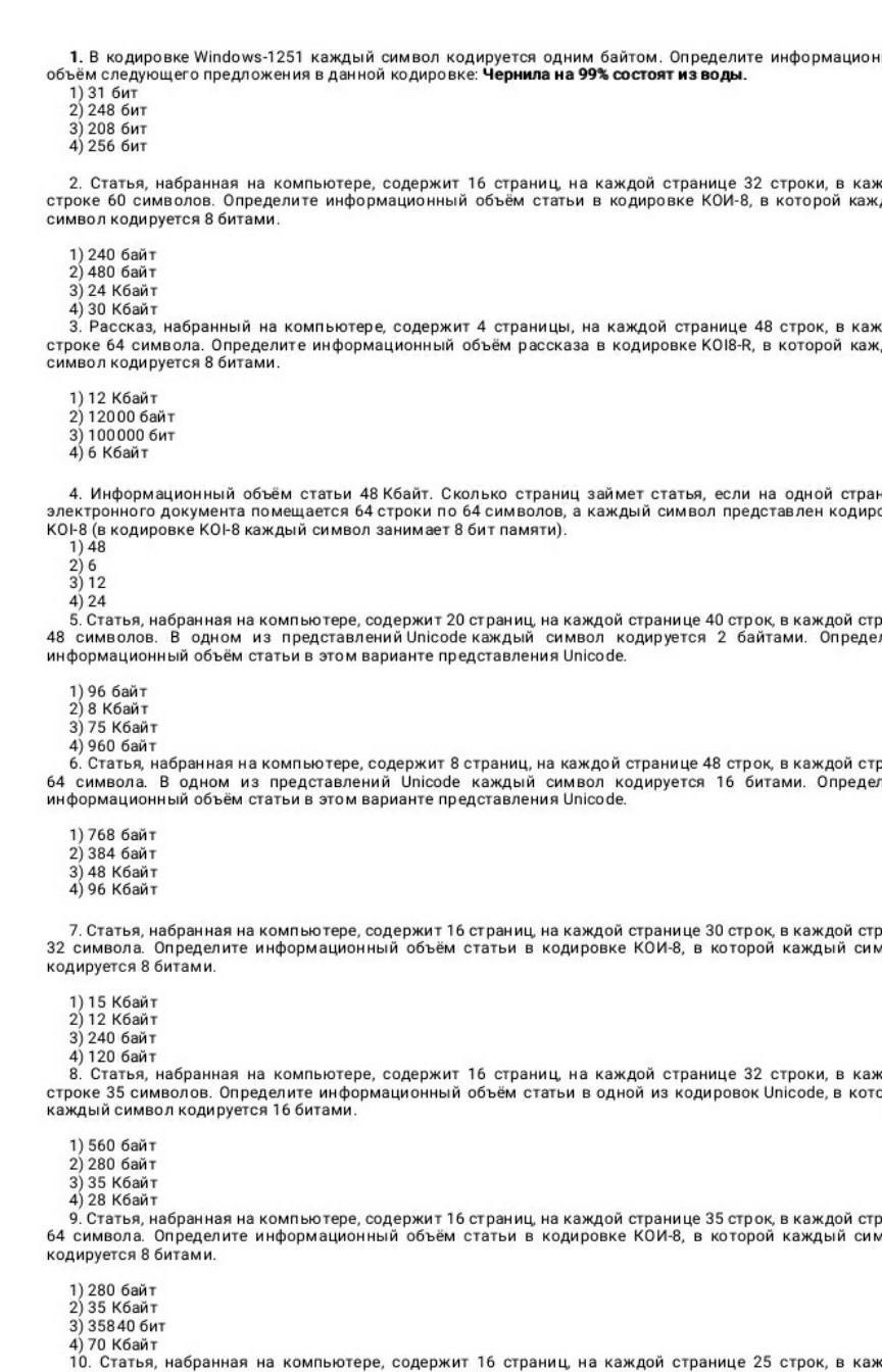 10. Вопрос не видно, но принцип такой: страницы*строки*символы. Если кодировка 8 битов, то так оставляешь в байтах, или можешь выразить в Кбайтах (раздели на 1024), или вырази в битах умножь на кодировку. Если кодировка 16 битов, то все свое произведение строк, символов и страниц умножаешь на 2, это в байтах, или умножаешь на 16, это в битах.