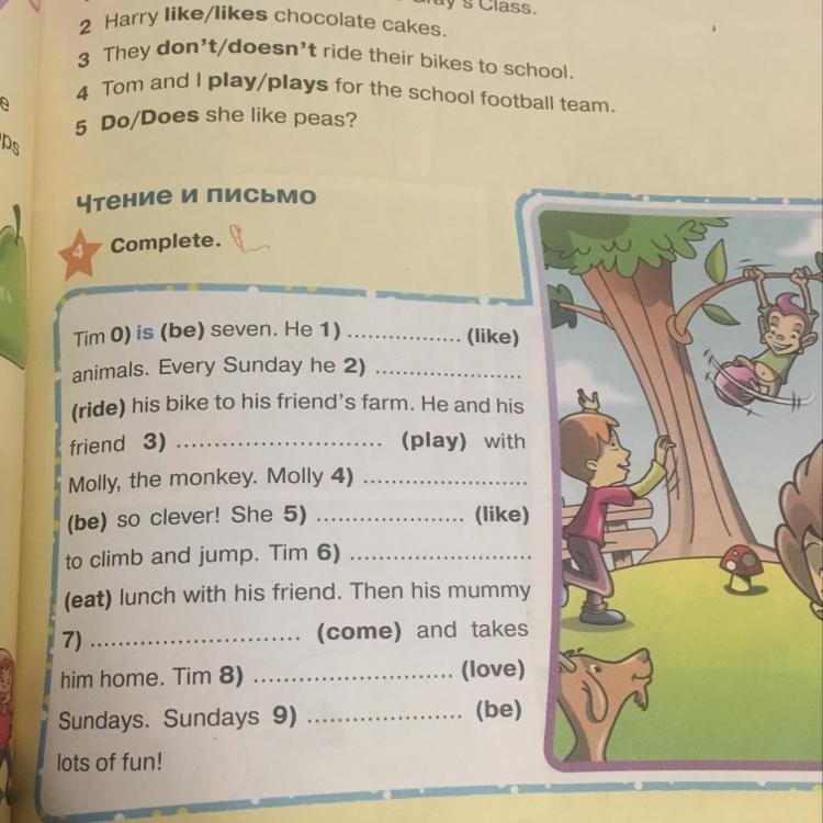 Tim is seven. He likes animals. Every Sunday he rides his bike to his friend's farm. He plays with Molly, the monkey . Molly is so clever! She like to climb and jump. Tim eats lunch with his friend. Then his mummy comes and takes him home. Tim loves Sundays. Sundays are lot of fun!