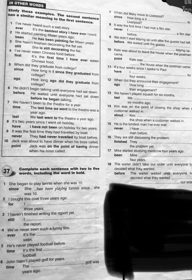 I’ve been wearing this coat for three years. I’m still writing the report. It’s the first funny film we have ever seen. It’s the first time he is playing football. The last time John played golf was years ago. How long is it has been since Mary moved to Liverpool. I have never met a film star before. We waited until the guests leave, before starting tidying up. Kate was on the point to leave the house when the postman came. I haven’t spoken to Paul for four weeks. How long ago have they announced their engagement? We played last squash six months ago. Kim was about to the close the shop when a customer walked in. I have never the kindest man before. They haven’t finished discussing the problems yet. Mike has been studying medicine for four years. The waiter waited until everyone has decided what they wanted before taking our order.