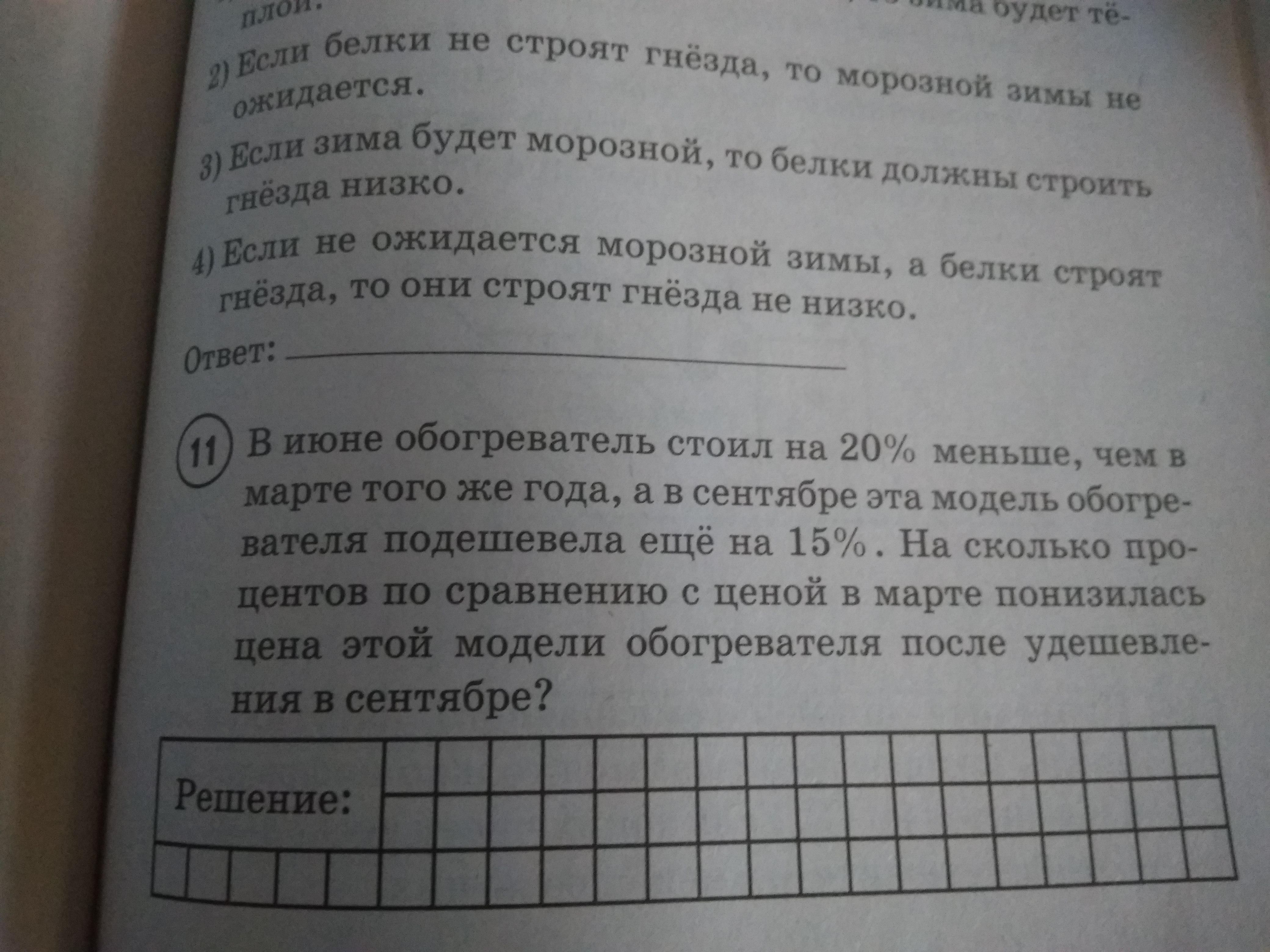 СРОЧНО!!!!!!!!!!! В июне обогреватель стоил на 20% меньше чем в марте того же года а в сентябре это модель обогревателя подешевела еще на 15% на сколько процентов по сравнению с ценой в марте понизилась цена этой модели обогревателя после удешевления в сентябре?