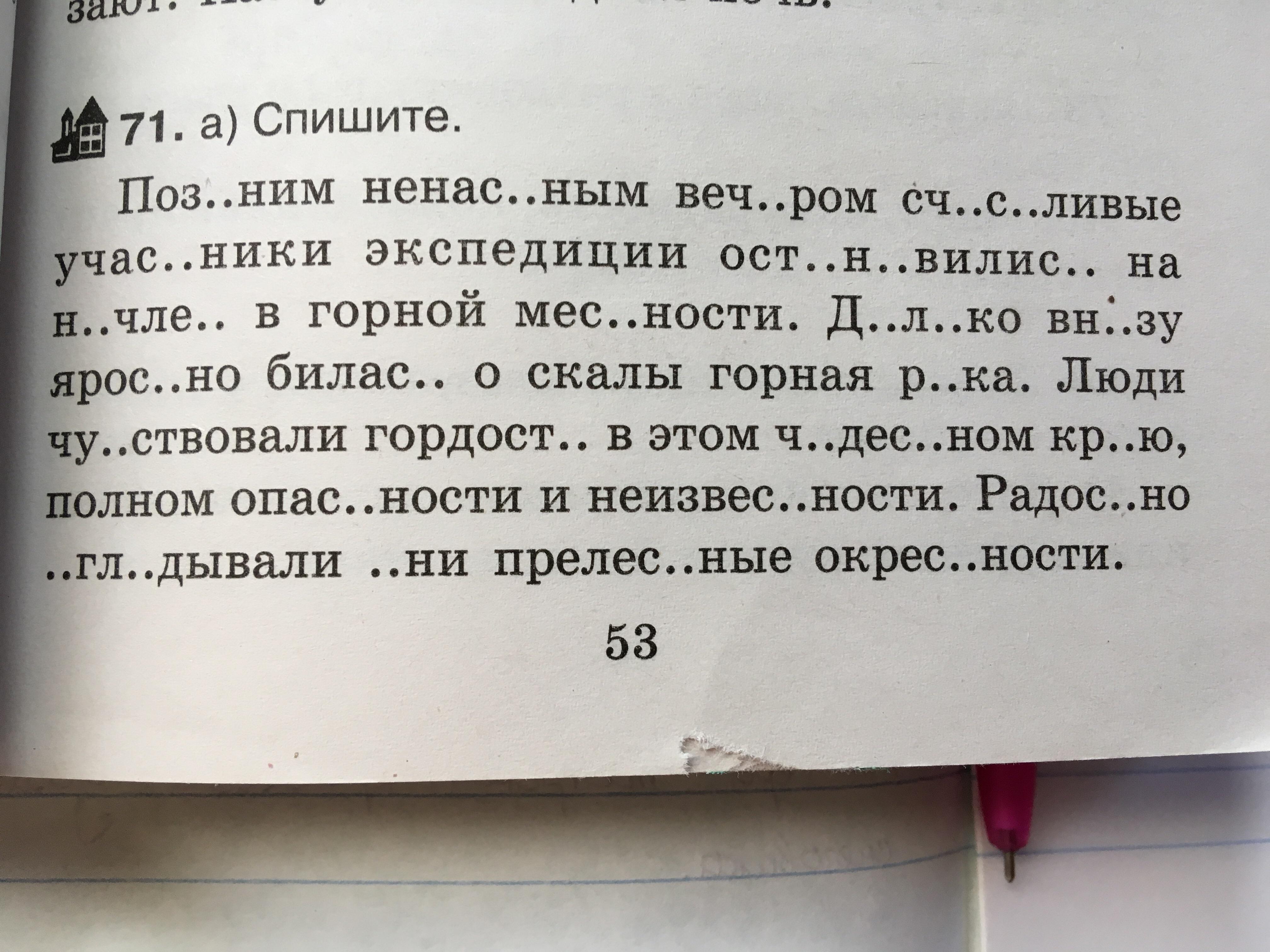Поздним ненастным вечером счастливые участники экспедиции остановились на ночлег в горной местности.Далеко внизу яростно билась о скалы горная река.Люди чувствовали гордость в этом чудесном краю,полном опасности и неизвестности.Радостно оглядывали они прелестные окрестности.