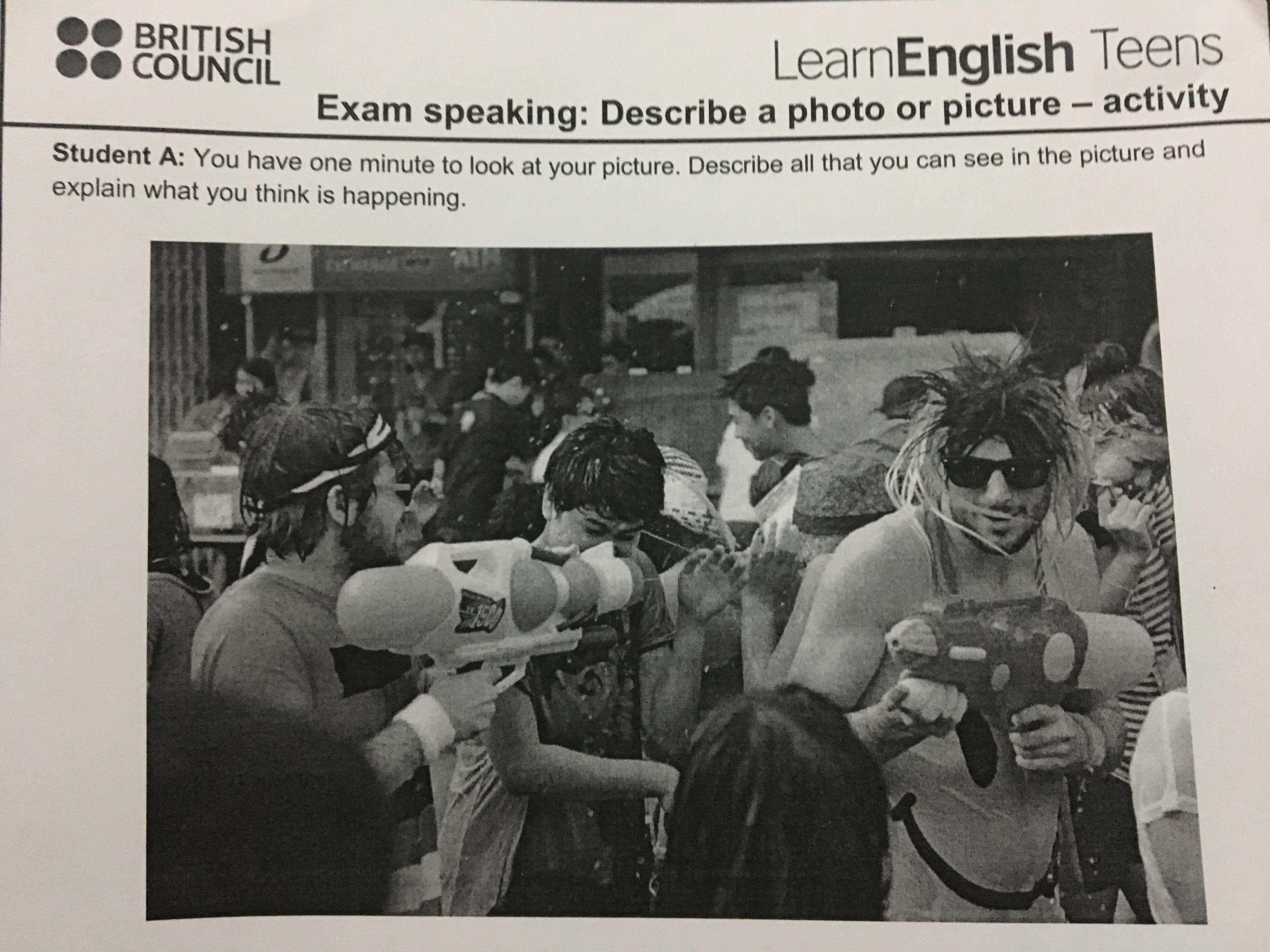 Я вижу радостных людей играющих с водными пистолетами. Если приглядеться, то можно подумать что это фестиваль какой-нибудь)