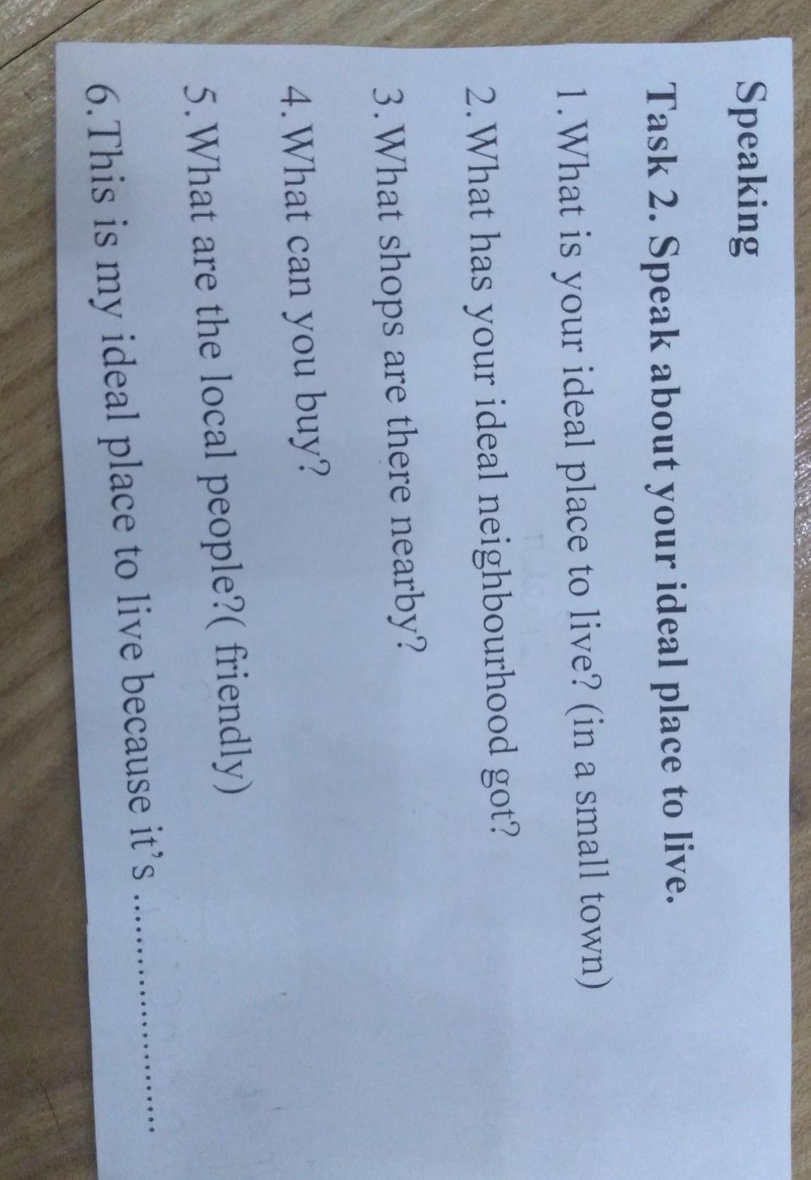 Задание 2. Расскажите о своем идеальном месте для жизни 1. Каково ваше идеальное место для жизни? (в маленьком городке) 2. Какое у тебя идеальное соседство? 3. Какие магазины есть поблизости? 4. Что вы можете купить? 5. Каковы местные жители? (Дружелюбный) 6. Это мое идеальное место для жизни, потому что это