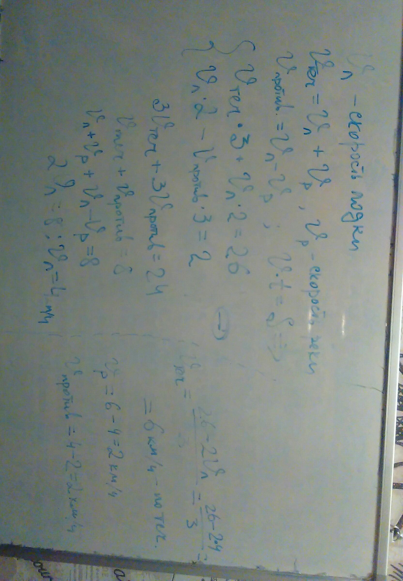 лодка за три часа по течению и 2 часа по озеру проходит 26 км эта же лодка за три часа против течения проходит на 2 км меньше чем за 2 часа по озеру. найдите скорость лодки по течению и против течения? помогите пожалуйста решить.