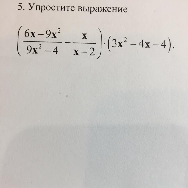 ((6x - 9x²) : 9x² - 4) - x : (x - 2)) · (3x² - 4x - 4) = ( - 3x(3x - 2) : (3x - 2)(3x + 2) - x : (x - 2)) · (x - 2)(3x + 2) = ( - 3x(x - 2) - x(3x + 2)) : (3x + 2)(x - 2)) : (3x + 2)(x - 2) = -3x² + 6x - 3x² - 2x = 4x - 6x² = 2x(2 - 3x)