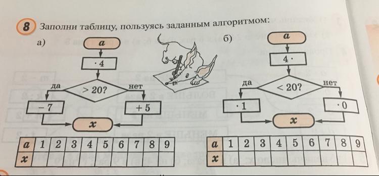 В первой части мы берём А из таблицы, затем умножаем это А на 4, если А больше 20, то мы вычитаем 7, если меньше, то прибавляем 5.