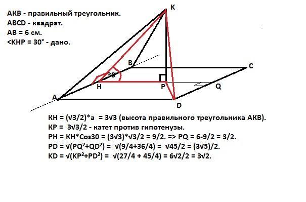 КН = (√3/2)*а = 3√3 (высота правильного треугольника АКВ).