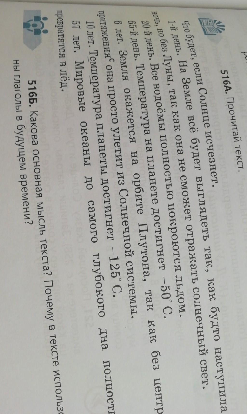 основная мысль текста- То что без солнца будет очень плохо, будет холодно, темно и т.д.. в тексте использованы глаголы буд.вр. потому что ещё солнце не исчезло и этого ничего не наступило, и ещё может в будущем исчезнит)