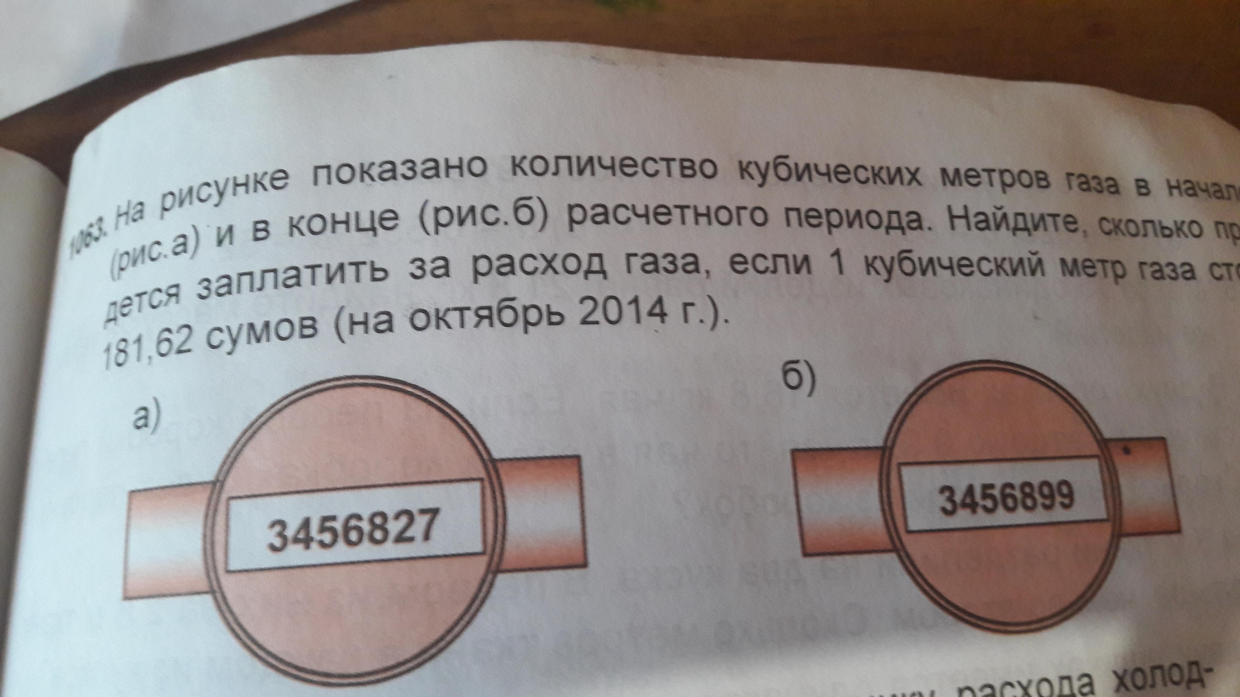 На рисунке показано количество кубических метров газа в начале(Рис.а) и в конце(Рис.б)резьбы расчётного периода.Найдите,сколько придется заплатить за расход газа,если 1 кубический метр газа стоит 181,62 сумов