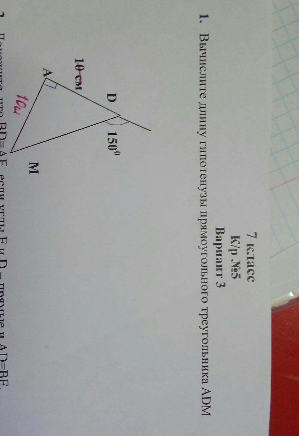 Смежный с внешним углом при вершине Д угол равен 30° по свойству смежных углов. Против угла в 30°лежит кате АМ, значит, гипотенуза ДМ в два раза больше по свойству, и тогда гипотенуза равна 10*2=20/см/