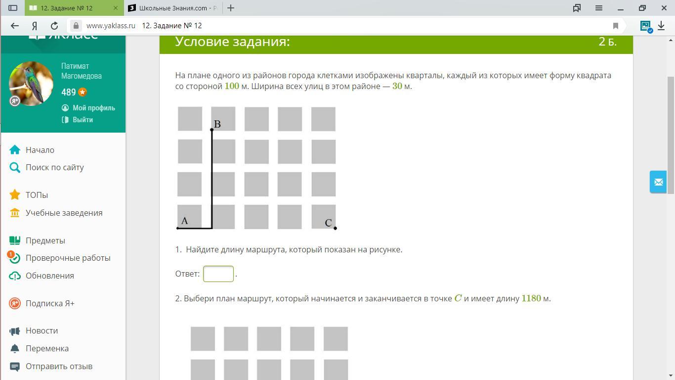 2. Выбери план маршрут, который начинается и заканчивается в точке C и имеет длину 1180 м.