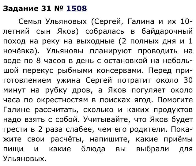 1. Поскольку 8 часов — это 480 минут, два дня по 8 часов — это 960 минут. При гребле энергозатраты взрослых составляют 4,5 ккал/мин, а энергозатраты Якова 2,25 ккал/мин. Поэтому за 2 дня гребли Ульяновы потратят: