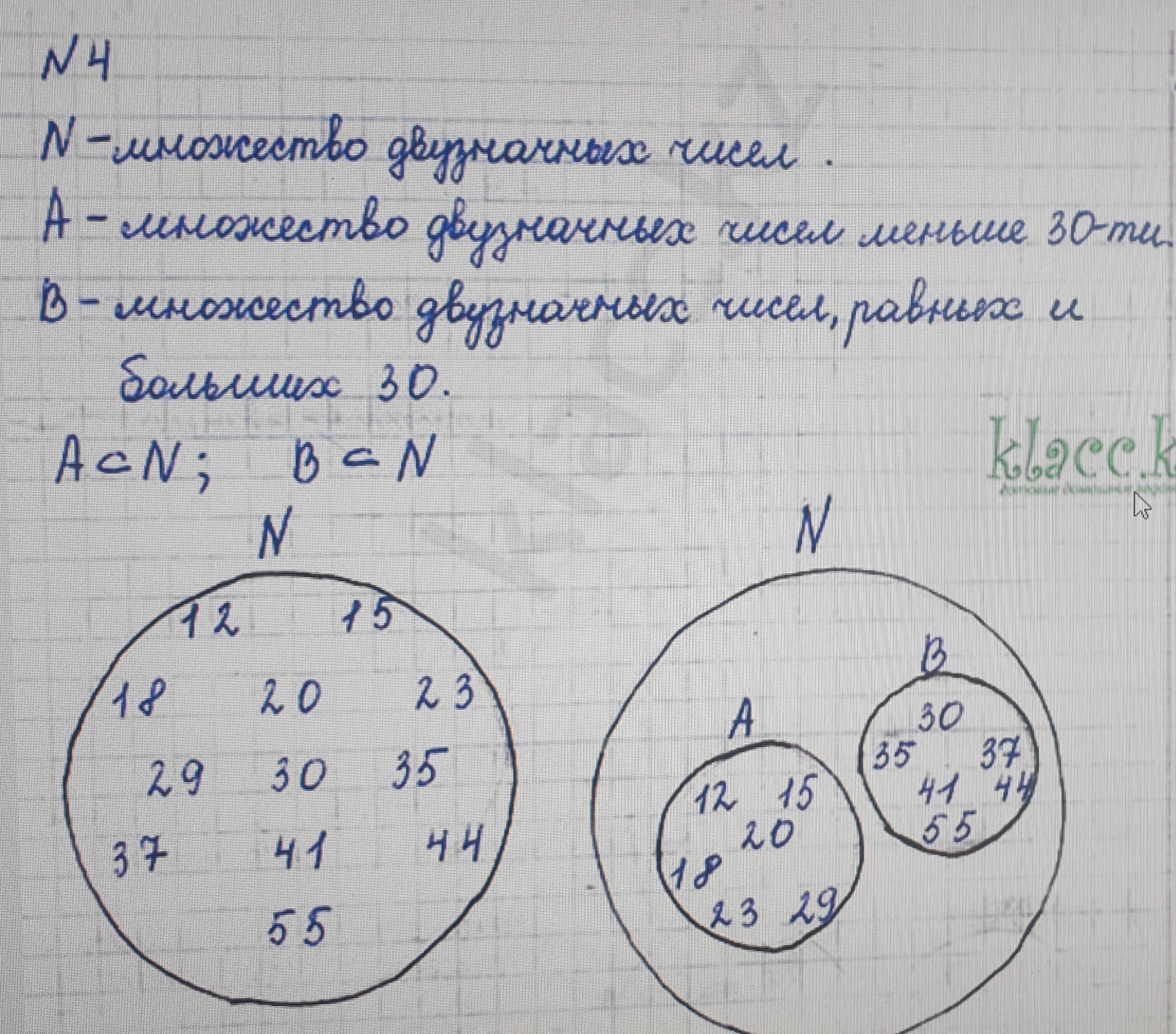 изобрази при помощи диаграммы Эйлера-Венна,запиши несколько элементов в диаграмме. N-множество двузначных чисел.A- множество двузначных чисел меньше 30-ти.B-множество двузначных чисел, равных и больших 30.
