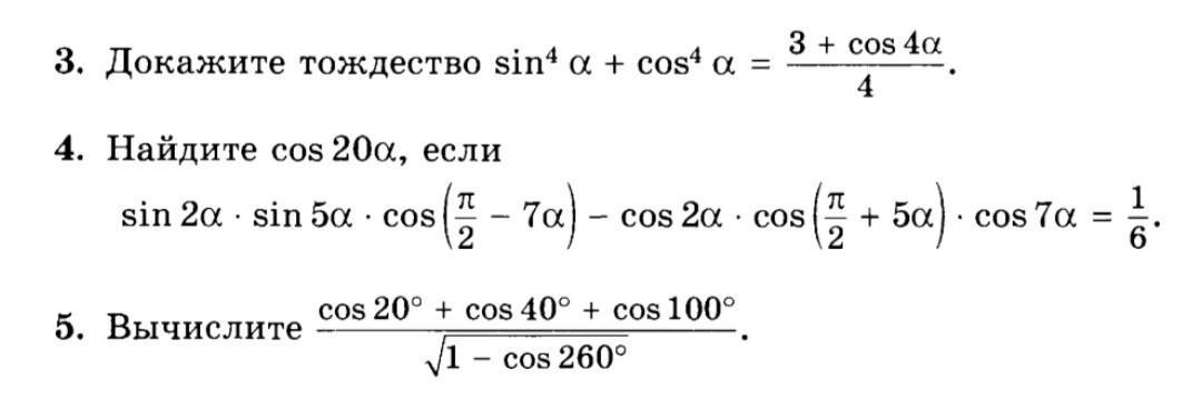 1) sin⁴α + cos⁴α = sin⁴α - 2cos²αsin²α + cos⁴α + 2cos²αsin²α = (cos²α - sin²α)² + 2cos²αsin²α = cos²2α + 0,5sin²2α = 0,5(1 + cos4α) + 0,25(1 - cos4α) = 0,5 + 0,5cos4α + 0,25 - 0,25cos4α = 0,75 + 0,25cos4α = 3/4 + (cos4α)/4 = (3 + cos4α)/4.
