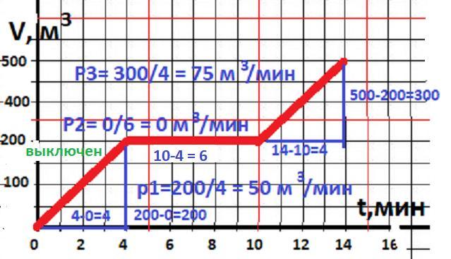 р1 = (200 - 0) : (4-0) = 200/4 = 50 м³/мин = р1 - до остановки - ответ.