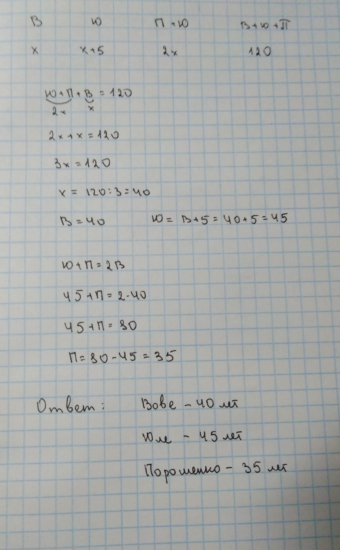 Есть три брата - Вова, Юля и Порошенко. Их суммарный возраст составляет 120 лет. Вова на пять лет моложе Юли. Суммарный возраст Юли и Порошенко в два раза больше возраста Вовы. Сколько лет каждому из братьев?