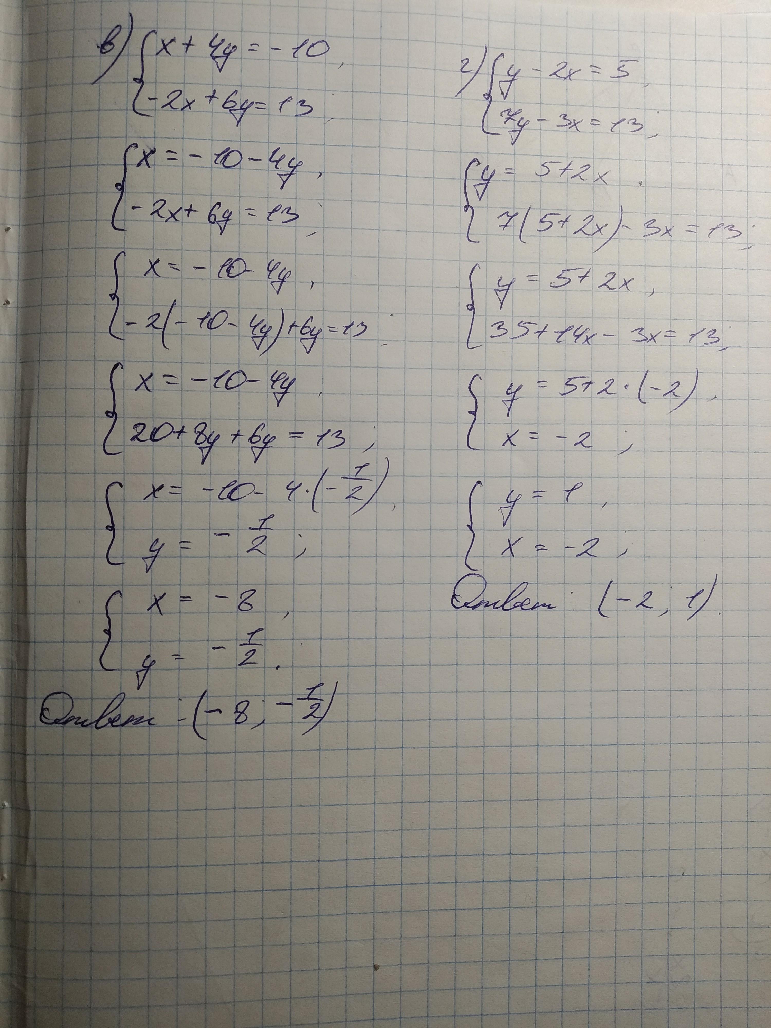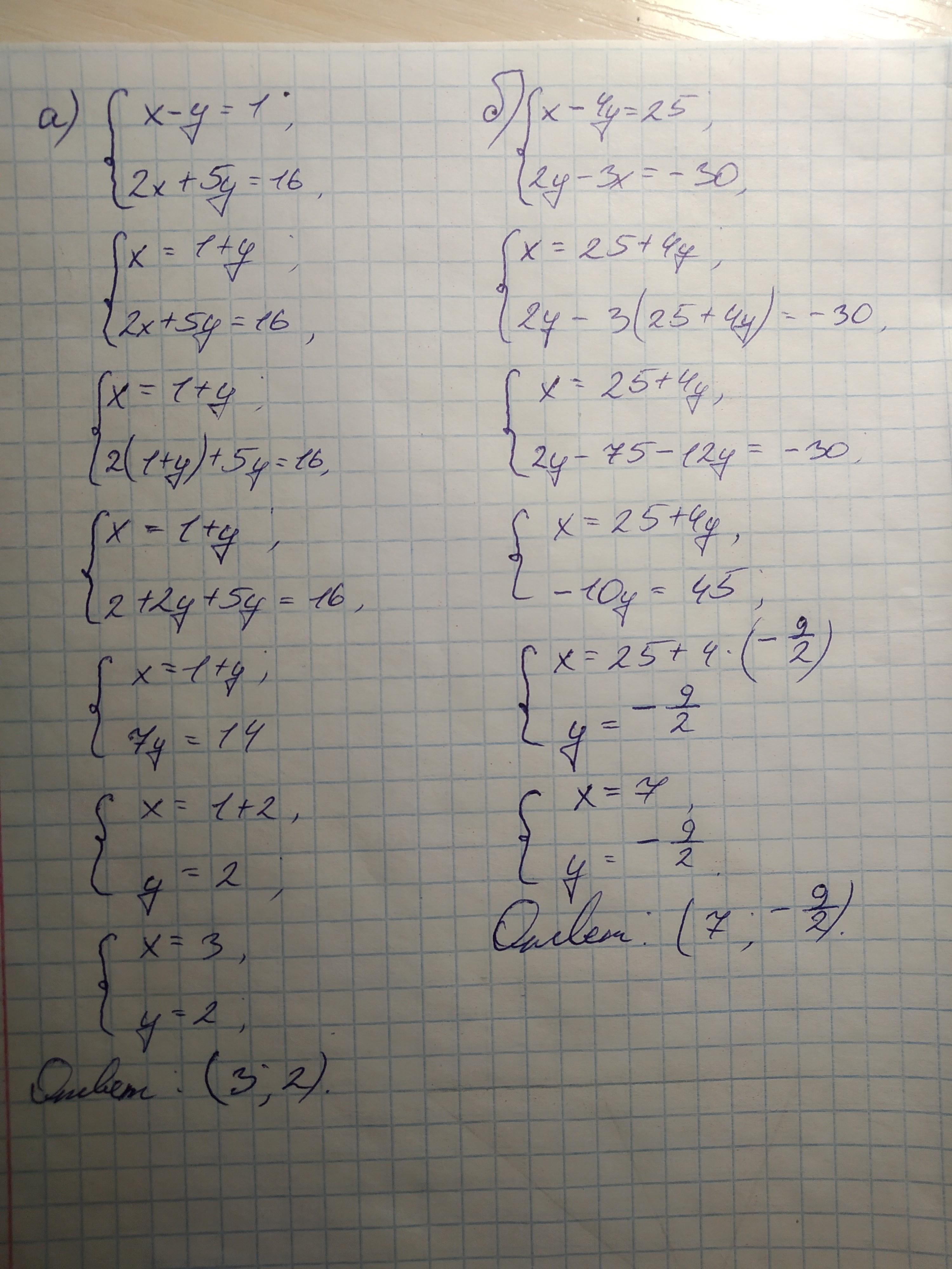 решите системы уравнений: а) х-у=1 ,2х+5у=16; б) х-4у=25, 2у-3х=-30; в) х+4у=-10, -2х+6у=13; г) у-2х=5, 7у-3х=13: