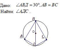 ΔАВС=ΔСВД, по общей гипотенузе ВД и катетам АВ=ВС, по условию, то ∠АДВ =∠ВДС=90°-30°=60°