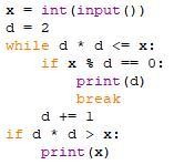 Найдите самый маленький натуральный делитель числа x, отличный от 1 (2 ≤ x ≤ 30000).