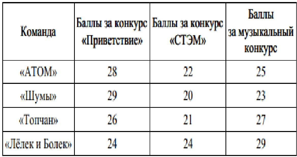 Сколько суммарно баллов набрали команды за музыкальный конкурс?