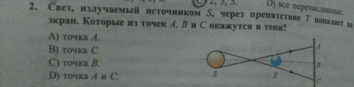 свет, излучаемый источником S, через препятствие T попадает на экран. Которые из точек A,B и C окажутся в тени