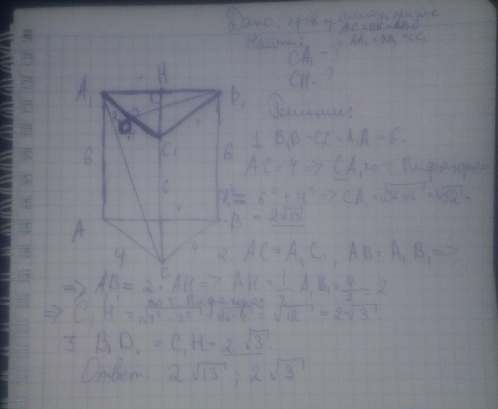 ВВ₁=АА₁; СА₁=√(АА₁²+АС²)=√(6²+4²)=2√13