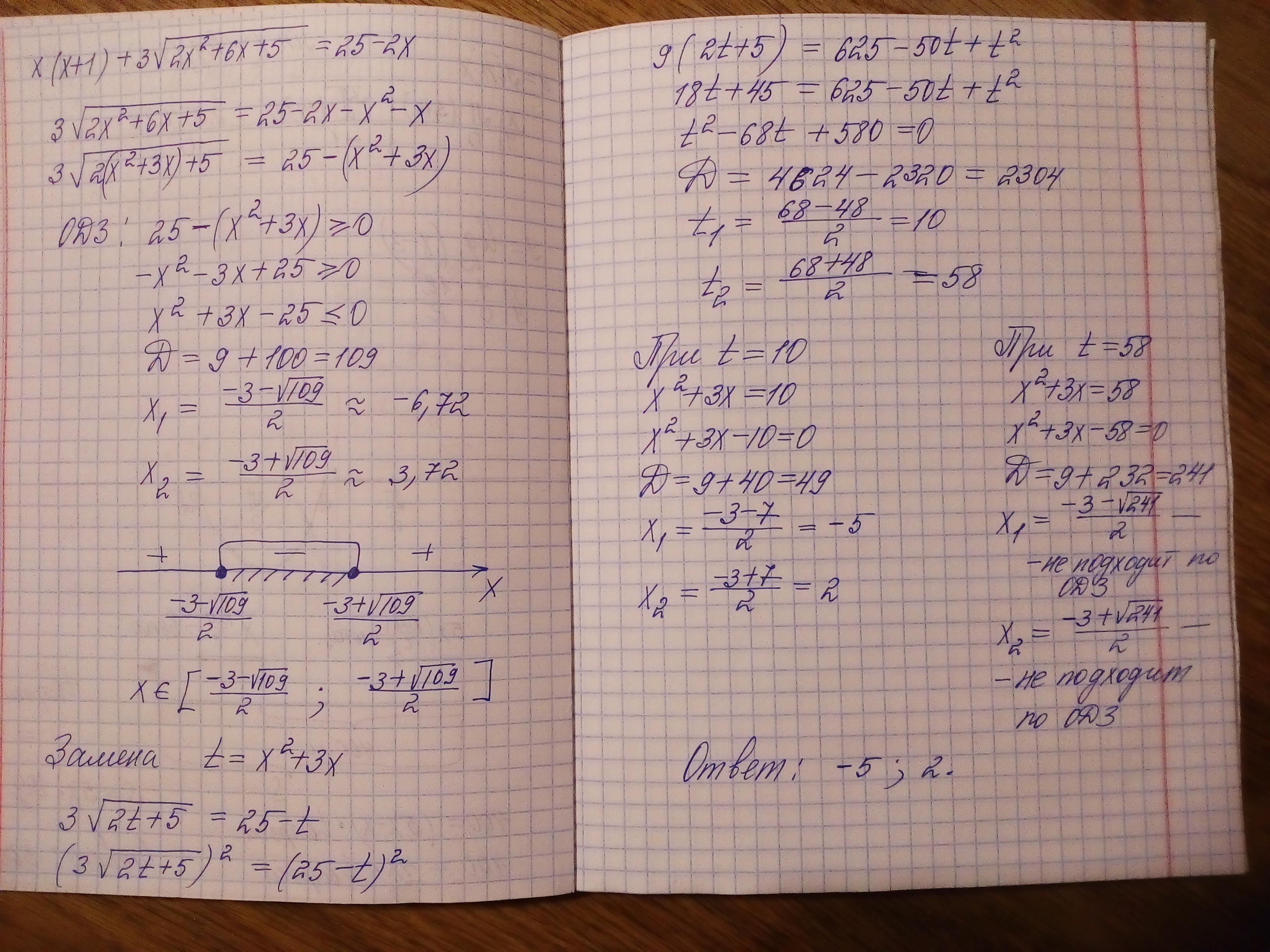Угадываем t=10 (проверка: 10+15=25 - верно). Поскольку левая часть возрастает, а правая постоянна, других решений нет.