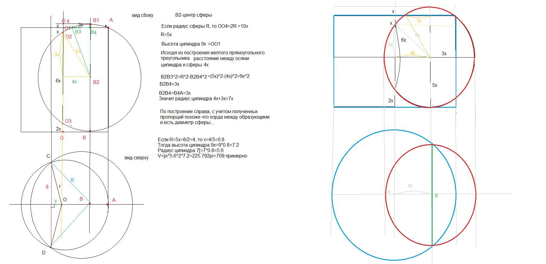 ний. Найдите объём цилиндра, если известно, что сфера касается двух