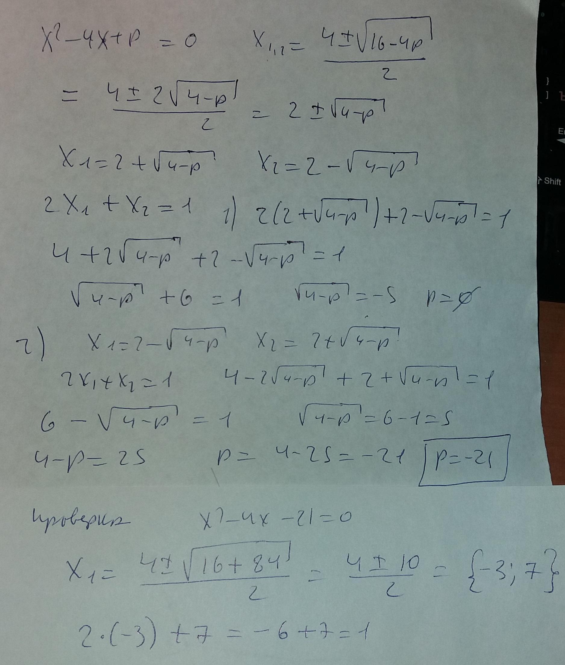Корни квадратного уравнения x^2-4x+p=0 удовлетворяют условию 2x1+x2=1