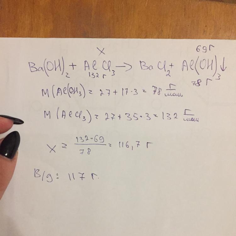 при взаимодействии гидроксида бария с хлоридом алюминия выпадает 69г осадка. определите, какова масса хлорида алюминия, выступившего в химическую реакцию.