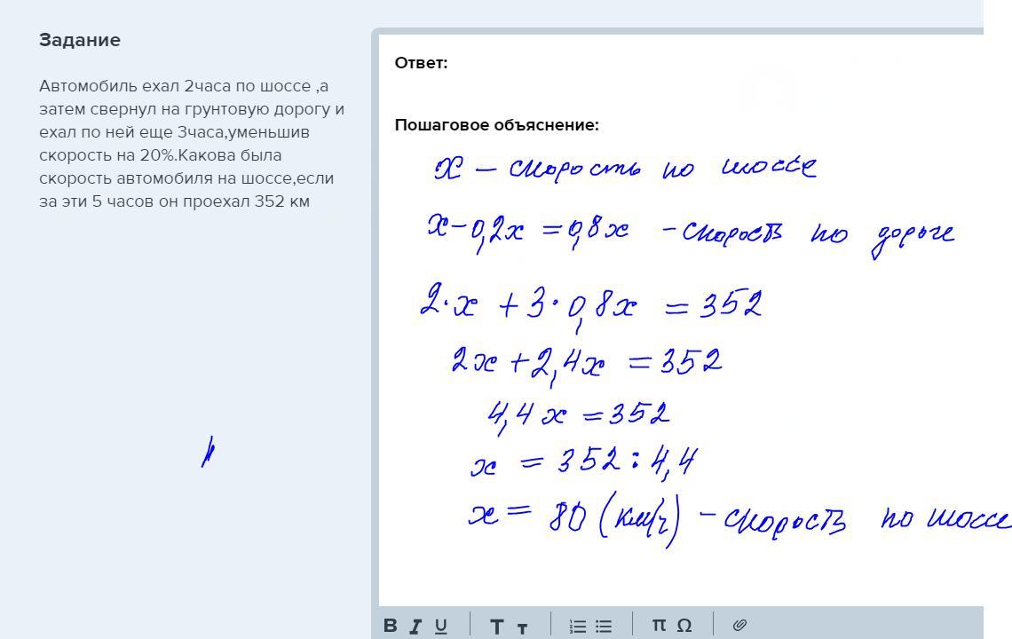 Автомобиль ехал 2часа по шоссе ,а затем свернул на грунтовую дорогу и ехал по ней еще 3часа,уменьшив скорость на 20%.Какова была скорость автомобиля на шоссе,если за эти 5 часов он проехал 352 км